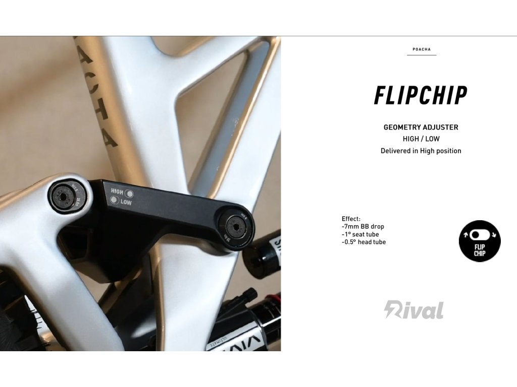 So zdvihom 180 mm vpredu aj vzadu má POACHA dostatočné rezervy na veľké horské línie, no zároveň ostáva obratný pre rýchle zmeny smeru a technické triky. Vďaka Reach Adjusteru si môžeš doladiť dĺžku rámu a rázvor o ±5 mm. Integrovaný flip chip navyše uľahčuje úpravu geometrie podľa terénu a štýlu jazdy. Základné nastavenie „High“ sa dá prepnúť na „Low“ – zníži sa stred o 7 mm, sedlový uhol sa položí o 1° a hlavový uhol o 0,5°. V režime High pomáha strmší sedlový uhol pri šliapaní, zatiaľ čo režim Low je ideálny na zjazdy a technické úseky.