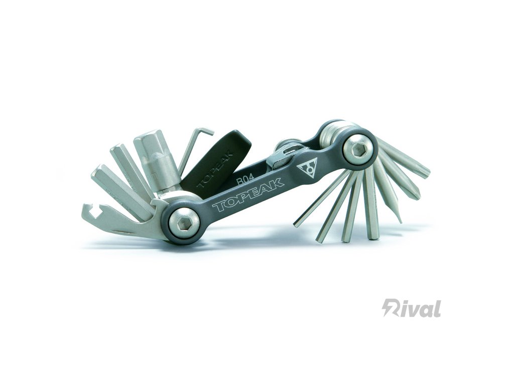 • odnímatelný nýtovač řetězu z CrMo oceli se skrytým 4 mm inbusovým klíčem pro dotahování samotného těla multiklíče a výklopná lopatka pro případ zatlačení pístů diskové brzdy při zacvaklých destičkách